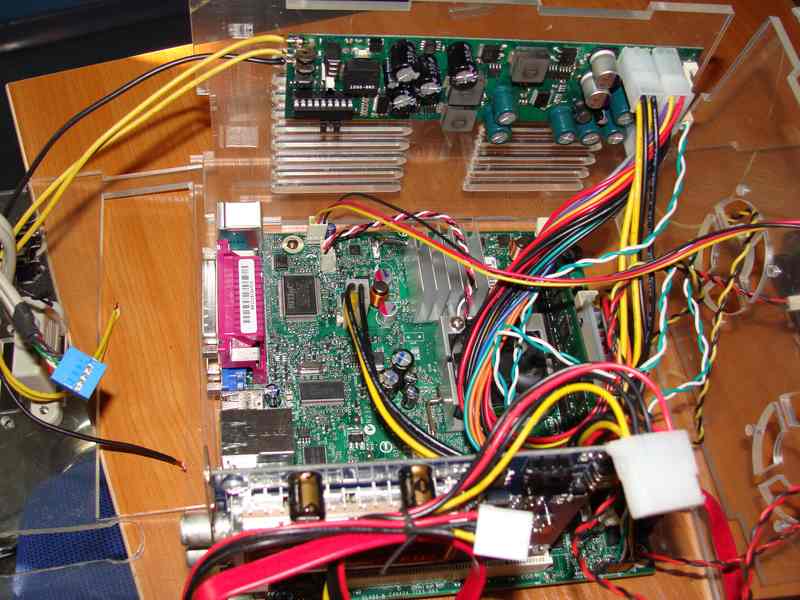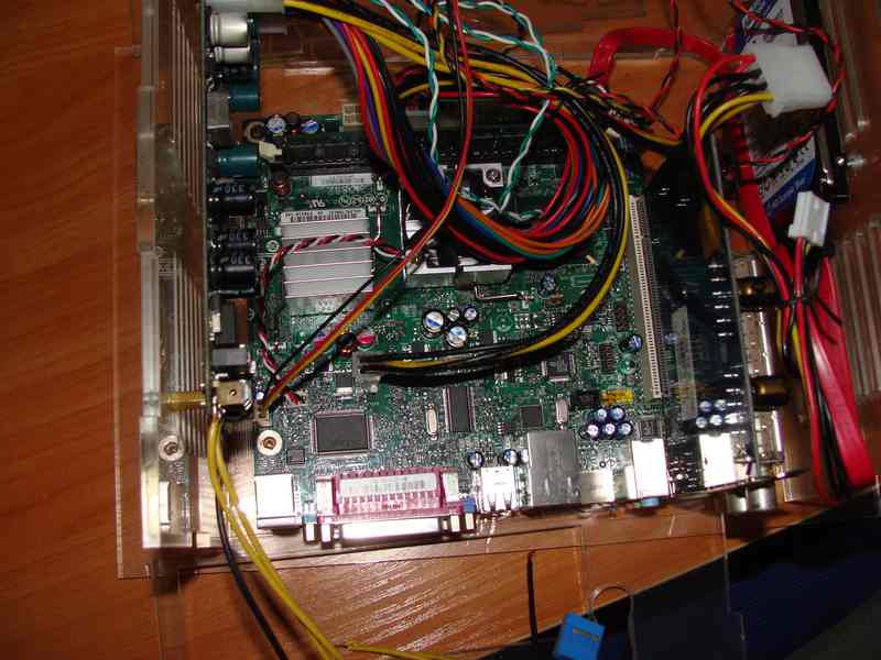 1 Мать Intel D945GCLF2 945GC/ICH7+Atom330(1.6Gh 2x512Kb) 1xDDR2-667 D-Sub 1xPCI 4-ch 2xSATA 1xU100 LAN mini-ITX 2 HDD- ноутбучный 500 гектар 3 TV плата Beholder 4 Блок питания M2-ITX 5 Три вентилятора 6 Оперативка 1 г Корпус сначала делал из старого спутникового ресивера ,но после приобретения Beholder-а пришлось отказаться от этой затеи ,немного подумав заказал в универе корпус из оргстекла ,на лазерном станке резали встал в полторы штуки красивый ![]() |