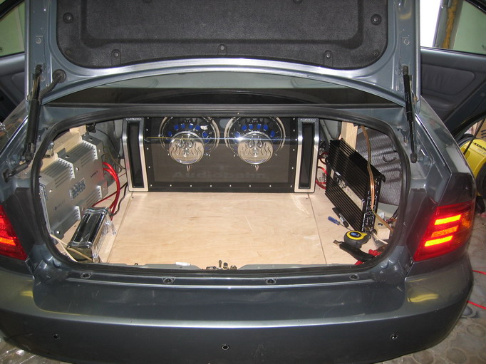 Итак...всвязи с тем, что желаемые колонки не влезли в боковые ниши, пришлось переделывать весь багажник. Были демантированы усилитель, компьютер и дополнительные аккумуляторы со всеми креплениями. Осталась прежней только несущая конструкция пола багажника. После чего нашлось место под сабвуфер (пришлось уменьшить люк для запасного колеса), было сделано крепление для усилителя для сабвуфера...демонтаж и монтаж занял около 12 часов работы Усилитель к сабвуферу...за ним расположены 2 дополнительных аккумулятора кондер подключен параллельно аккумуляторам... крепление сабвуфера, решили закрепить ремнями ипользую клипсы ремней для центрального пассажира внешний вид багажника на данный момент, как вы заметили, компьютера пока нет, он будет находиться за черным усилителем справа, в нише... плеер пришлось вынуть из машины, тк из-за баса анти-шок не справлялся ![]() ![]()