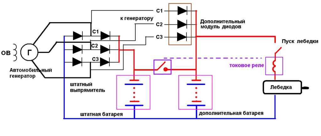 Я примерно так себе и представлял схему вкл. доп. аккумулятора! Правда у меня были мысли ставить релюхи с конкретными уставками по току или по напряжению, но не знаю, существуют ли такие пригодные для установки в авто сеть. |