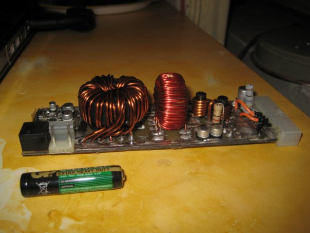 встроенный контроллер на pic,логические транзисторы,их драйвер,все на разьемах, провод транса сечением 1.8,встроенное реле 30А,транзисторы и шоттки планируется вынести на общий для всех компонентов кар писи радиатор...батарейка рядом размера ААА...обсуждаем... |