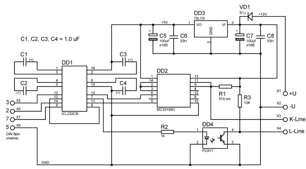 Проверить K-L адаптер просто-подав +5в на 3(TX-com) точку видим изменения на K-Line.Подавая -12 на K-Line видим изменения на 2(RX-com) точке.Это по моей схеме-примени к себе.