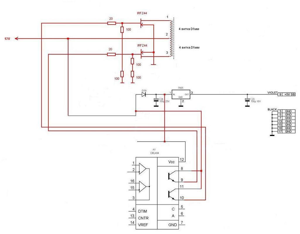 Повесил на +12В галогенку на 55Вт - напряжения в норме, ПГ в норме. Повесил вторую лампочку туда же - спалил IRFZ44 ![]() Выпаял транзисторы, проверил еще раз всю переделанную схему, все в норме. Впаял новые транзисторы, все заработало. Опять повесил две галогенки, только вторую уже на +5В. Все нормально, напряжения держит, ПГ 5.1В. С материнкой не работает. ПГ так же плавает 1.5-4.2В. Единственное, заметил, что дежурка с материнкой 4.94-4.95. |