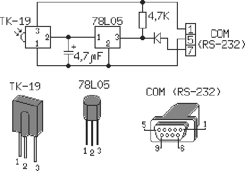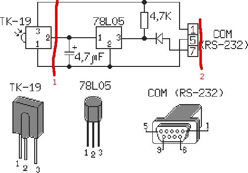 Вот еще есть одна схема Lirc-а: "Многие желающие воспользоваться программой SlyControl для дистанционного управления компьютером, в частности, при просмотре видео, TV, DVD, SatDVB и др. сталкиваются с очень ненадежной работой программы с самодельными модулями DCD. На самом деле, сама программа работает довольно четко и устойчиво. Причина заключается в том, что в схеме DCD, данной в описании программы SlyControl, как сам фотоприемник, так и COM порт работают в нестандартном режиме. В частности, COM порт требует для четкой работы своих входов двуполярных сигналов обеспечивающих ток порядка 2 мА, выходной ток фотоприемников TSOP1836 по паспорту не должен превышать 0.5 мА. В приводимых повсеместно схемах DCD это не обеспечивается. Поэтому, в стандартную схему DCD были внесены изменения, заключающиеся в добавлении схемы преобразования логических уровней TTL в двуполярные уровни COM порта. Преобразователь уровней выполнен на p-n-p транзисторе Т1 КТ361 с любой буквой. Номиналы резисторов R1 -R3 подобраны так, чтобы обеспечить на входе DSR COM порта плюс/минус 5 В, что вполне допустимо. Ток по выходу DATA фотоприемника не превышает 0.5 мА. Получаемая фазировка сигнала DSR четко соответствует требованиям программы SlyControl. Эксперименты, проведенные с усовершенствованным модулем DCD и программой SlyControl 2.7.12 показали практически безукоризненную и четкую работу различных стандартных инфракрасных пультов. Если до переделки, работа пульта RC-5 (Samsung) была нечеткой, пульт то управлял компьютером, то нет, то после усовершенствования, работа пульта стала очень четкой, а пульт начинал работать правильно практически сразу после загрузки программы. При этом, совершенно неважно, что запускается в первую очередь, то ли, например, ProgDVB или SlyControl. Стоит попросить автора программы SlyControl при усовершенствовании своей программы проследить за тем, чтобы после загрузки программы на выходе DTR COM порта оставался сигнал минус12 В, а на выходе RTS соответственно плюс 12 В." |