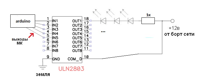 Вот. он тока подает сигнал на вход ULN, а тот коммутирует на землю выходы.