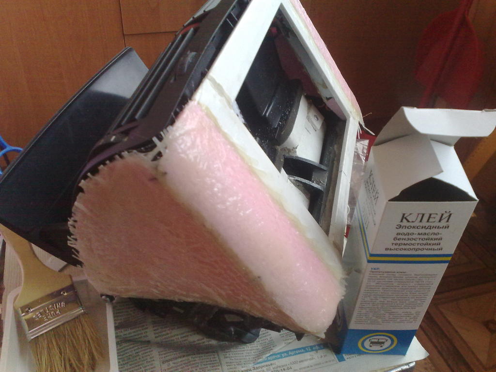 Был куплен лист экструдированного пенополистирола толщиной 20мм. Из него сделаны стенки корпуса и приклеины к корпусу клеем Момент Монтаж универсальный. |