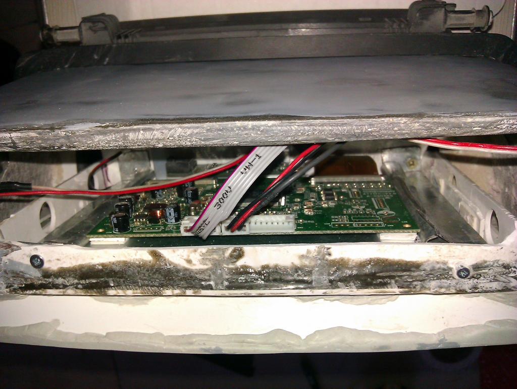 тач приклеен на матрицу при помощи двухстороннего скоча, матрица прижата к корпусу при помощи металических пластин, контроллер приклеен к обратной стороне матрицы на двухсторонний скотч.