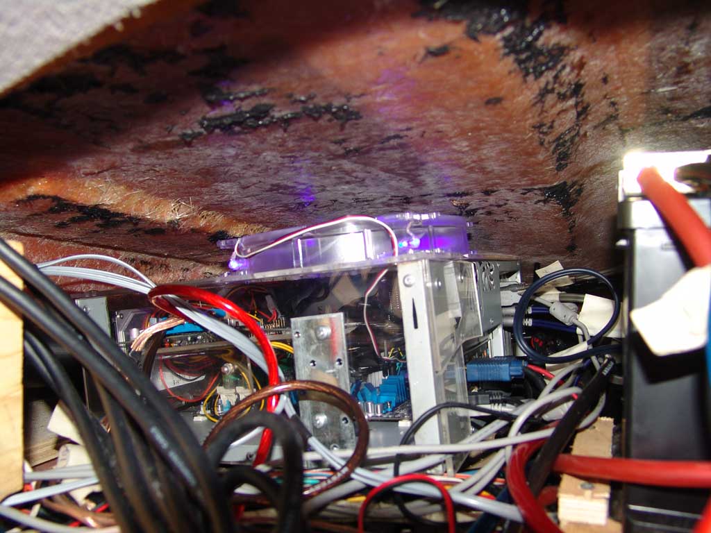 О компе: процессор-Intel Core i5-661 3.33 Мать-Asus P7H57D-EVO Звуковая-SB X-Fi Titanium Fatality Champion HDD- SSD 160 Gb Kingston и 500 gb Seagate Монитор-Acer led 19" wide touch Блок питания-M4ATX Сети: Asus WiFi, Yota GPS Globalsat BU-353 Клава Logitech Illuminated Трекбол был куплен вместе с тачскрином, антивандальный железный Второй монитор Sony Bravia 32" через преобразователь 220в CDRom внешний, Sony Ожидается с ебая ELM327 и Arduino Mega2560 По звуку: 2 уся Audison LRx 6.6 усь саба Alpine PDX-1.1000 кондер Stinger SPC 505 5Ф Акустика: Передняя пара: нч Morel вч Morel MT-23 кроссы Morel Средняя пара: нч Focal K2 Power 165 KRX2 ВЧ Morel MT-23 кроссы Focal Задняя пара: MbQuart, старый какой то, топовой линейки, 2х компонент Центральный канал: передняя часть салона - нч и вч Morel Integra Ovation 6 задняя часть - нч Morel Integra Ovation 6 вч 2x Morel MT-11 Саб самоделный, головы Onyx, спецификации утеряны, куплены с Субарика участвовавшего в соревнованиях по автозвуку. Используется две аудиокарты, встроенная для системных звуков и навигации, SB для музыки и кино. Операционка Win 7. Недавно был установлен второй аккумулятор AGM 95 а\ч, через УРА. Камера заднего вида выведена на отдельный монитор, установленный вместо зеркала заднего вида, на всякий пожарный....... Подогрев и охлаждение технического отсека реализовано от заднего климата. Фото 1: корпус компа, сделан из поликарбоната, на основе старого ATX. Фото 2: Блок усилителей. Фото 3: Общий вид технического отсека, задний монитор снят. Фото 4: Вид из пассажирского салона. Фото 5 и 6: Общий вид консоли водителя. Фото 7: Клавиатура и панель SB.