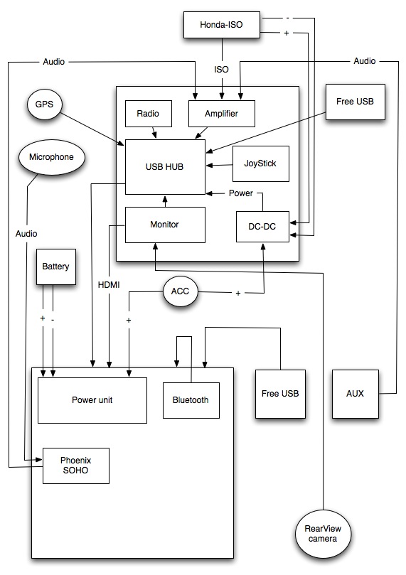 нашел ошибки построения в схеме. USB нужно использовать по максимуму те которые распаяны на материнке и по минимуму USB-HUB. Расстояние из под сидения до устройств будет не большим, работать должны стабильно, а с хабом могут быть проблемы. Радио лучше повесить на длинном проводе поближе к антенне (это тебе авторы радио должны были дать указания). Микрофоны лучше использовать USB, а не аналоговые. |