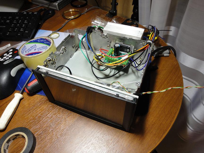Всё встало отлично, нисколько не пожалел что порезал корпус от монитора. Потом началось вживление потрохов монитора, и усилителя. Возникла сложность при установке внутренностей из-за короткого шлейфа от тачскрина, пришлось плотнячком втыкать HDMI.