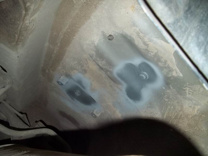 Дабы сделать крепление в полу багажника (пацанский вариант с саморезами в пол отметается автоматически) необходимо снять защиту глушителя вместе с глушителем :-) Посему крепление выполняется в виде болтов М6, прикрученных к полу. Болты для защиты от коррозии со стороны улицы покрываются грунтом и слоем резины. Болты были выбраны подлинее по причине - не было нужного размера под рукой :-) Излишки будут обрезаны.
