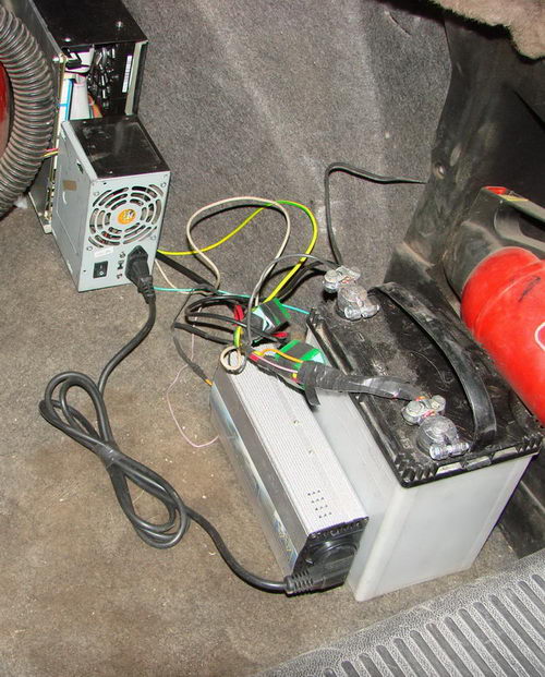 MB Formoza I810, PentiumIII-700МГц, DIMM-256Mb,HDD-40Gb, звук и видео на борту. Звук передается в магнитолу через FM-transmitter. Моник Super SP-945 9.2'' с VGA входом. Управление, радиокомплект миниклава и мышка.USB GPS-приемник JJ-Connect. Питание компа через ивертор (300Вт) и плюс резервный аккумулятор. Собрал блок питания SL, но не понравился большой перкос по напругам и по результатам тестирования было принято решение пока перейти на инвертор. Что бы врезать моник в панель, была выкинута пепельница с прикуриватеелем, все равно не пользуюсь. Комп поселился в багажнике, т.к. в салоне для него оказалось тесно.