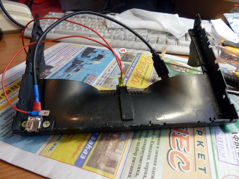 К лицевой части крепится планшет, который удерживается планкой с тыльной стороны, и платка с кнопками. К задней части крепится планка с USB разъемом и выключатель полностью отключающий 12В (на всякий случай, пусть будет). Лицевая и задняя части скрепляются между собой Ставить буду сюда. Поверх открытого нижнего бардачка. Крепиться конструкция будет сбоков к планкам, оставшимся от первого варианта. В бардачке будет расположен БП и активный хаб. Стыкую проводочки, разъемчики. Заталкиваю всю эту жуть в бардачок и креплю конструкцию. Вуа ля! Включилось и заиграло сразу. Да, о звуке. Поскольку USB Audio на этом планшете завести на данный момент удалось, то использую штатный аналоговый выход. Звук на AUX-IN подан через подавитель помех на ВА3121. В паузе тишина. Ничего не скребет, не шуршит. Кстати, не так уж и плох звук оказался у моего Pipo.