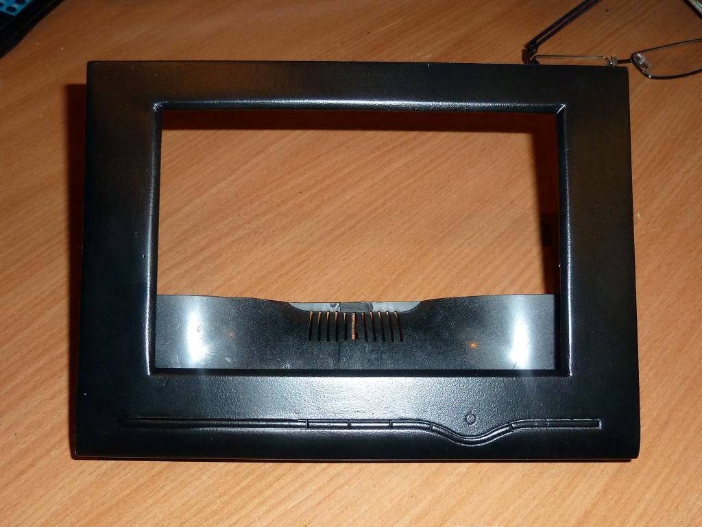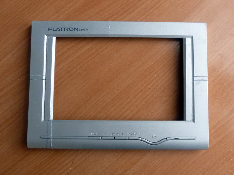 Из лицевой рамки выпилены четыре заготовки для лицевой панели планшета. Кнопки монитора будут сохранены. К ним подключатся выведенные кнопки планшета. Снизу будет зеленая подсветка на СМД светодиодах.