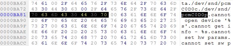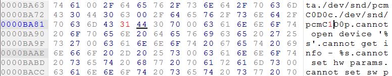 Итак первый этап с драйверами считаю пройден..поэтому двигаемся дальше. p.s\\ А для тех "кто в танке" читаем начало этой темы. Второй левел. Роутинг звука. Вариант 1 Достаем файл /system/lib/hw/audio.primary.rk30board.so, кидаем на комп. Открываем его в HEX-редакторе, ищем по значению pcmC0D0p. Это имя устройства вывода звука по умолчанию в /dev/snd/ Меняем его на pcmC1D0p, сохраняем, кидаем обратно где и брали. Перезагружаемся. Готово! Теперь юсб карта стоит по умолчанию, и планшет думает, что это его родное устройство. При таком варианте все отлично работает, за исключениям карт Creative, у которых не поддерживается частота дискредитации в 44.1kHz, а только 48kHz и выше... В этом случае звук возможно будет играть, но в сильно ускоренном темпе. Либо вообще не работать =) p.s Creative X-Fi HD таким способом заставить петь мне не удалось... Еще бывает такое, что в либе не удается найти имена устройств для правки, тогда облом...смотрим вариант2. Вариант 2 Использование либ ALSA Качаем архив, распаковываем и кидаем файлы на планшет по соответствующим путям. Не забываем выставлять права доступа, смотрите какие у соседних файлов. Смотрим под каким номером определилась ваша карта. Код: