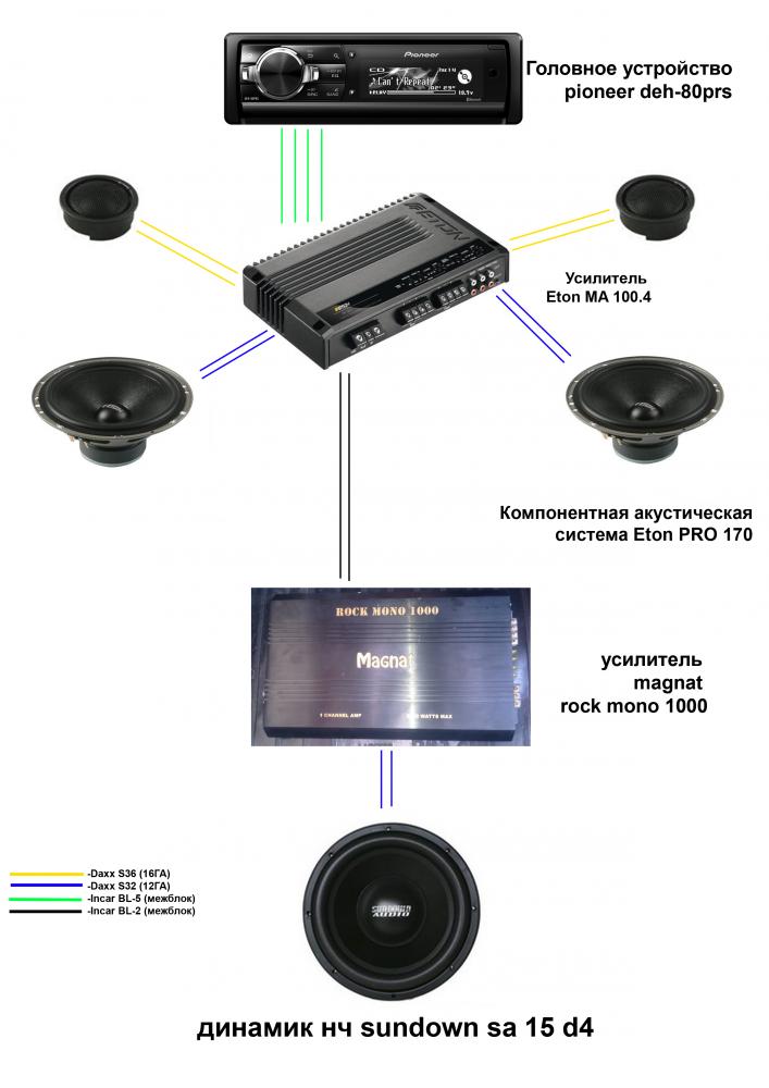 1. Сделана полностью шумо и виброизоляция салона Информация об аудиосистеме Г/у (магнитола): Pioneer DEH-80PRS Фронтальная акустика: Eton PRO 170 Сабвуфер(ы): Бренд - Sundown, Размер - 15, количество - 1 в коробе Усилитель(и): Eton MA 100.4 - фронтальная акустика, Magnat Rock Mono 1000 - сабвуфер Конденсатор: Stinger SPCO11 Доп. аккумулятор: Нет Проводка: DAXX S32(12GA), DAXX T28, T45, DAXX P02-R(2GA), DAXX P02-B(2GA), DAXX S36(16GA), S.Q. SQVLPL18BL, INCAR BL-2, INCAR BL-5 Кросоверы не подключали, передняя акустика подключена через усилок вместе с пищалками. После того как была установлена данная система появилась задумка установить комп в машину. Монитор с тачскрином установили на подставку на двухсторонний скотч рядом, слева от магинотлы и рамки - ничего не переделывали хотя мысли и были. Моник регулируется вверх внизу вправо влево очень удобно я скажу, меня пока устраивает. Привод двд рома был установлен вместо подстаканников ниже магнитолы. Сам системник установили в нишу возле запаски там как раз место было. Вели все через центр. Чуть позже смогу скинуть описание железа. Также был взят хаб с внешним питанием на 8 портов юсб, все внешние подключенные устройства тянет проблем нет. Для того чтобы не было помех куплен гальванический переходник на моник за 1000 рублей. Также установил 2й монитор в потолок который пришел чуть позже с китая - 14 дюймов. Сейчас кино смогут смотреть и задние пассажиры. Можно подключить клаву и мышку беспроводную и спокойно управлять. Задний моник который в потолок не сенсорный. На него также установили гальванический переходник в питание чтобы небыло помех. 2 монитора работают одновременно. Для этого был подключен разветвитель на 4 монитора, того питание которое было в разветвителе вполне хватило чтобы подключить его к питанию машины. Изображение одновременно идет на 2 монитора сразу - что я и хотел. Комп подключен на данный момент к магнитоле pioneer 80prs сзади через aux2, можно смотреть фильмы и слушать музыку с компа через магнитолу но качество не такое хорошее конечно, т.к. aux. Также был куплен внешний процессор alpine 701 с менеджером но его не ставили, планирую это сделать чуть позже. в ближайшее время поеду на соревы по автозвуку все будет играться без компа с магнитолы, заявился в качество и в давление по новичкам- хочу попробовать посмотреть а там дальше думать в каком направлении двигаться. Хочу услышать совет в каком направлении двигаться с той системой которая у меня сейчас стоит на данный момент. Хочется на будущее чтобы вся музыка шла через комп а магнитола только как дополнение или вообще без нее, т.е. через внешний проц. В материнке есть оптика и звук как я понял можно сразу вывести через оптику на внешний проц и дальше на усилки и колонки. Что можно дальше добавить или поставить в моей системе? Что посоветуете? можно сделать 5.1 в машине и участвовать в мультимедии на соревах, - дополнительно взять также динамики етон + усилок на динамики + динамик встроить в торпедо по центру, задние динамики на подиумы и на задние стойки, передние выворачиваем к пасажиру. Динамик на торпеду по центру за консолью. Были мысль также систему построить трехполоску, возможно ли это и реально ли через комп потом это все разрулить - настроить для повседнева и сорев по качеству, нужно ли мне еще чтото брать из оборудования и ставить. Жду советов. Сам в раздумьях |