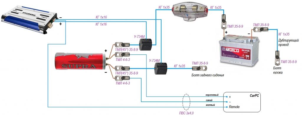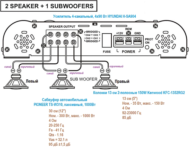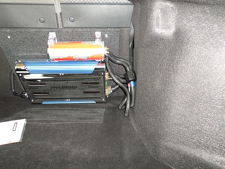 • усилитель – Hyundai H-SA904, ном. 4х90 Вт, макс. 750 Вт • динамик сабвуфера – Pioneer TS-W310, ном. 300 Вт, макс. 1000 Вт, 95 дБ, Ø30 см • передние динамики – Kenwood KFC-1352RG2, ном. 35 Вт, макс. 150 Вт, 84 дБ, Ø13 см • конденсатор (ионистор) – Supra SCAP-10 1Ф. • корпус сабвуфера – «стелс» с щелевым фазоинвертором 40 л • провода питания – КГ-1х35, КГ-1х16 • межблочные провода – Klotz MC5000 • акустические провода – ПВС-2х4.0 • дистрибьюторы питания – У-734М Звук у меня 2.1, т.е. два динамика в передних дверях плюс сабвуфер. При установке передних динамиков столкнулся с тем, что динамики не влазят в посадочное отверстие в двери. Померял диаметры: отверстие в двери - 110 мм, динамики - 112 мм. Пришлось изготовить проставки из фанеры толщиной 10 мм. Проставки промазал несколько раз каким-то защитным грунтом. Сначала была идея изготовить сабвуфер типа «Стелс» самостоятельно с помощью полиэфирной смолы. Но потом на радиорынке нашел готовый щелевой сабвуфер «Стелс» и купил его, решив не заморачиваться с изготовлением вручную. Объем сабвуфера – 40 л, изготовлен, со слов продавца, в Тольятти. По паспорту на динамик сабвуфера объем ящика с фазоинвертором должен быть 42.5 л. Думаю, разница в 2.5 л для моего слуха не существенна. Плюс к усилителю протащил от АКБ по левому низу. Из подкапотного пространства в салон провод просунул через заглушку трубок гидрокорректора. От минуса АКБ кинул дополнительный провод в гофре на кузов параллельно заводскому проводу. Акустические провода (на передние динамики и сабвуфер) – ПВС-2х4.0. К передним динамикам протащил в гофре по правому низу. Под задним сиденьем протащил их через какую-то пластмасску, предварительно выломав в ней пару ребер жесткости. Межблочные провода – самодельные из Klotz MC5000. Оплетка подключена только со стороны системника. Протащил посередине машины. В качестве дистрибьюторов питания использовал "орешки" У-734М. Провод КГ-1х35 в клеммы усилителя не влазит, поэтому сделал отводы из КГ-1х16. Питание системника и провод Remote протащил справа по низу. Для обжима наконечников использовал пресс-клещи ПГРс-70 производства КВТ. Усилитель прикреплен к деревянной пластине (из фанеры 10 мм), оклеенной карпетом, которая крепится к задним сиденьям. Таким образом, убил двух зайцев - нет электрического контакта между корпусом усилителя и кузовом, и есть зазор примерно 1 см между дном усилителя и пластиной для вентиляции. Усилитель к пластине крепится болтами через пару гаек, чтобы обеспечить зазор. Пластина крепится к сиденью железными дюбелями. Задние сиденья расположены неравномерно - левая половина примерно на 1 см выдается вперед по отношению к правой половине. Чтобы выровнять пластину - под левые дюбели подложил несколько шайб. Предохранитель закреплен на железной Г-образной металлической полосе толщиной примерно 2 мм. Размеры сторон - 50х150 мм. Полоса согнута не под прямым углом, а примерно под 15 гр. В пластине заранее насверлил дырочек под две различные колбы. Т.к. системник пока не установлен - музыку слушаю с телефона, подключенного к усилителю через выход на наушники. Remote подключен через микропереключатель к плюсу. Может быть, когда-нибудь придумаю какой-нибудь короб, чтобы закрыть провода, подходящие к усилителю и конденсатору. Разноцветной изолентой помечены плюс и минус питания.