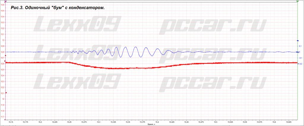 Напомню исходные данные: • Динамик сабвуфера Pioneer TS-W310, ном. 300 Вт, макс. 1000 Вт, 95 дБ • Динамики Kenwood KFC-1352RG2 (2 шт.), ном. 35 Вт, макс. 150 Вт, 85 дБ • Усилитель Hyundai H-SA904, 4х90 Вт, макс. 750 Вт • Конденсатор (ионистор) Supra SCAP-10 1Ф Для исследования использовал цифровой USB-осциллограф. Частоту дискретизации установил 100 кГц. Длительность записи около 20 сек. Зажигание выключено, все потребители тоже выключены. Музыка воспроизводится с телефона, подключенного к усилителю через выход на наушники, т.к. CarPC на этот момент я еще не установил. Громкость накрутил побольше, чтобы полкооператива послушало. Красный сигнал – напряжение на клеммах АКБ. Синий – сигнал с датчика давления, расположенного в багажнике рядом с сабвуфером. Соответственно, когда сабвуфер «бумкает» – появляются импульсы на синем графике. Рассмотрим общую панораму - Рис.1 и Рис.2. Видим, что напряжение на АКБ при использовании конденсатора более сглаженное. Особенно хорошо это видно во время «бумканья», когда напряжение проседает. Больше никаких кардинальных различий нет. Напряжение проседает примерно одинаково. Максимальное напряжение снижается примерно с одинаковой скоростью в обоих случаях. Частота «бумканья» около 2 Гц. Далее рассмотрим одиночный «бум» поподробнее - Рис.3 и Рис.4. Здесь хорошо видны пульсации напряжения при отключенном конденсаторе. Также видно, что спад напряжения во время начала «бума» более пологий при наличии конденсатора. Восстанавливается напряжение примерно одинаково. Других существенных различий, опять-же, нет. Замеряем напряжение - Табл.1. Мерить буду нечто среднее, т.к. присутствуют шумы. Напряжение на АКБ при подключенном конденсаторе в среднем на 0,01-0,03 В выше, чем при отсутствии конденсатора. Величина просадки напряжения меньше в среднем на 0,02 В. Разница очень мизерная во всех случаях. Вывод. По результатам проведенного "научного исследования" можно сделать вывод, что при заданных условиях наличие конденсатора практически не влияет на падение напряжения в автомобильной сети. Просадки напряжения в 0,13 В при отсутствии конденсатора, по-моему, недостаточно для притухания фар. Страшилки про притухающие фары возникают, скорее всего, либо при использовании плохих проводов питания (тонких, омедненных, китайских, и т.д.), либо при гораздо больших мощностях (бедные уши и мозг). Хотя, возможно, при включенных потребителях (фары, кондиционер, гидроусилитель) просадка будет побольше. Может быть, когда-нибудь исследую влияние конденсатора, так сказать, в боевых условиях. Ну и на десерт – осциллограммы тройного «бума» - Рис.5 и Рис.6. Исходные материалы (осциллограммы): во вложении. Открывать осциллограммы с помощью программы MtPro.