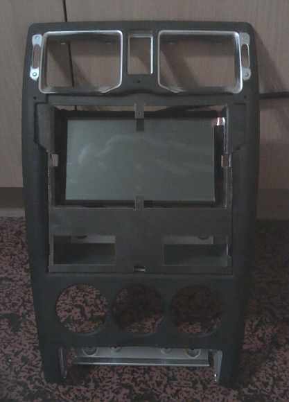 Самое сложное оказалось вмонтировать монитор в машину. Монитор в накладку консоли приборов решил вставить не в стандартные отверстия, а повыше, убрав часы и переместив кнопки вниз. Но есть проблема – слева и справа от монитора расположены винты крепления накладки. Решил расположить монитор под наклоном и утопить внутрь накладки, чтобы можно было добраться до винтов.
