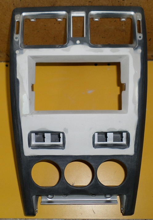 С первого раза реализовать задуманное не получилось. Практически загубил одну накладку. Всего было три рабочих варианта, и 150 вариантов в голове. 1-й вариант. Лепить рамку решил из массы для лепки Jovi, которая застывает на воздухе. Лобзиком выпилил кнопки и часть накладки. Лазерной резкой изготовил плоскую несущую пластину. Далее из металла изготовил прямоугольник, который вставил внутрь пластины и закрепил заклепками. Получилось все некрасиво. К тому же меня осенило, что ушки для крепления монитора можно изготовить целиком с пластиной. Т.о. этот вариант – в помойку. Фоток не будет, т.к. стыдно показывать получившееся… 2-й вариант. Гидроабразивной резкой изготовил второй вариант несущей пластины. Ушки для крепления монитора загнул на тисках с широкими губками. Примерил пластину вместе с монитором в накладке – вроде нормально получается, но нужно немного подогнуть верхнюю часть пластины. Из оцинковки сделал две опалубки сверху и снизу, чтобы лепнина не вывалилась. Несущую пластину прикрепил к накладке тремя винтами вверху, одном внизу и двух с боков. Начал лепить рамку. После лепки и сушки в течение суток лепнина усохла в размерах, появились трещины, а металл под лепкой заржавел из-за наличия влаги в лепнине. Сама лепка выглядела хрупкой, начал переживать, что все развалится на кочках. Но все-таки продолжил ваять рамку. Зашкурил лепнину. Далее зашпатлевал сначала шпатлевкой Novol со стекловолокном, потом финишной шпатлевкой Fine 421. Особенный геморрой был с изготовлением ровных внутренних поверхностей вокруг монитора. Выровнять шпателем не получалось. Придумал такую технологию. Выпилил прямоугольник из фанеры по размерам экрана монитора. Нанес слой шпатлевки на одну внутреннюю сторону несущей пластины. На фанеру положил кусок обычной бумаги А4, вырезанный по размерам фанерки. И, пока шпатлевка не застыла, сильно придавил этим «бутербродом». Лишняя шпатлевка выдавилась наружу, потом ее срезал. Подержал минуту, фанерку убрал, а бумага так и осталась на шпатлевке. Бумагу нужно отлеплять примерно минут через 15-20, т.к. если отлеплять через сутки – на шпатлевке останутся сильно прилипшие остатки бумаги. Таким же макаром изготовил и остальные внутренние стороны. Получились довольно ровные поверхности. Можно попробовать не обычную бумагу, а глянцевую, или специальную пропарафиненную/промасленную, в общем, чтобы меньше прилипала. Потом все это дело зашкурил уже под покраску. Нанес грунт – сразу проявились все косяки в виде трещинок, ямок и неровностей. На фотках есть темное пятно на грунте – это я вместо грунта схватил баллончик с краской. После грунта задул металликом – все косяки еще больше проявились. Ну и напоследок задул прозрачным лаком. В процессе работы над вторым вариантом осенило, что внутренние поверхности вокруг монитора можно изготовить на 3D-принтере. Получится все ровно и точно. А оставшуюся часть зашпатлевать. Начал устанавливать накладку в авто. Снял заводскую накладку, давай пихать свою. А она не лезет! В верхней части торпеды есть горизонтальные пластиковые ребра жесткости, которые упираются в верхнюю часть лепнины и ушки. Мат стоял на весь ГСК, т.к. я понял, чем это грозит. Хотя сам виноват – надо было сначала снять накладку и посмотреть, что там под ней твориться. Но где-то в глубине души теплилась надежда, что получить
