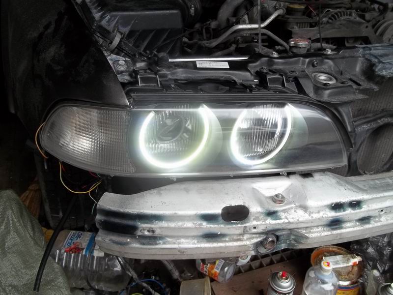 Имеем: праворульная оптика от BMW 5xx дорестайл линзовая. Нужно - поставить глазки, переделать под левый руль. Разница в галке - на праворульках галка на наших дорогах ослепляет встречку, вместо освещения обочины. Но на некоторых BMW есть система изменения стандарта освещения - либо галка, либо ровная линия. Решение простое и в это же время очень гениальное - чтобы при переезде из одной страны в другую (напр - англия-франция или наоборот) не клеить на фары наклейки - перещелкнул рычажок - и вуаля - свет встречных не слепит. Но меня такая ситуация не устраивает - я человек упрямый и хочу галку на обочину :-) Посему было принято решение - переделать шторку под линзой, благо дело очень простое. Ну и заменить убитые кронштейны отражателей - болезнь 5й модели - труда не составило, ибо уже такое делал. Ангельские глазки. Очень простая и очень красивая вещь. Но не все BMW ей оборудованы. На старых машинах устанавливаются сторонние глазки (либо LED, либо CCFL). Вот и на моей оптике штатных глазок нет. Посмотрел на ту порнографию, которую продают у нас - круг с несколькими сведодиодами....И которая стоит у всех риальных пасанов на марках и чайзерах будучи приклееными к рассеивателю фары (антитинюнг). Либо есть CCFL. Но подвел поставщик - продинамил меня 2 месяца. Выручила Москва. 4 дня - и комлект светодиодных шикарных глазок у меня на столе. Светят просто здоровски. Покрутил в руках глазки. Фары. Глазки. Фары. Посмотрел как их ставить - ставить за стекляшки - что очень просто - на стекляшку приклеил и все - не вариант - стекло граненое, искажает глазки будь здоров. О каких стекляшках идет речь? В 5й серии 39го кузова фары дорестайл - это стекло+пластик. Остается - ставить перед стекляшками. Что сложнее. Почитал в нете, как народ ставит - клеят на двусторонний скотч. Благо в комплекте идет. Ага. С нашими то дорогами и жарой. Нет. Мне надо надежно. Далее. Сами глазки - конструкция довольно хлипкая. Рассеиватель, плата со светодиодами и крышка. И все это очень хлипенько соединено. Явно для ИХ дорог. Потому как, если по глазке ударить - в ней все начинает звенеть. Вобщем так. Глазки были доработаны под использование на русских дорогах. Некузявая серая крышка, дающая серую оконтовку закрашена. Но сегодня думал что долбанусь с фарой на руках))) Эх....ну нас всех это ждет, мужики :-) В итоге вместо всей фары за сегодня поставил только одну глазку....
