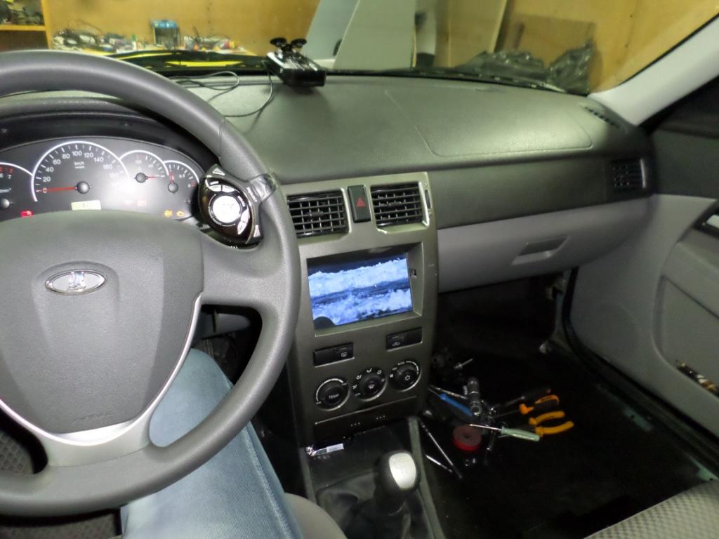 Прорези под винты (слева и справа от монитора) чуть-чуть меньше, чем надо - шайба на винте проходит только под наклоном. Главное, не уронить винт с шайбой. Без магнитной отвертки тут не обойтись, и то очень аккуратно надо действовать. Пук при включении. Надо бы увеличить задержку Remote. Присутствуют звуковые артефакты после загрузки Windows (на видео слышно в двух местах). Это притормаживает iCarDS. Шумов от генератора и прочего вроде нет, но специально их не выискивал. Надо будет отключить звуки загрузки/выключения Windows. Еще нужно сделать нормализацию громкости звука, вроде в Windows 7 это есть, да и проги кое-какие существуют. А то накачал клипов, а у всех разная громкость. Полосит монитор. Но он и дома полосил при подключении к домашнему компу. Возможно, что-то надо покрутить в настройках PowerStrip. Если прямо на монитор смотреть, то полоски не сильно видно, а под углом - видно хорошо. Для следующего варианта надо брать нормальный монитор. На предмет бликов и засветки днем не тестировал. Пока проехался ночью. В BIOS тоже прошью логотип LADA. Уже нашел, как это сделать. Но периодическое появление черного экрана во время загрузки все равно все портит. Было бы классно замутить какую-нибудь приблуду на Arduino, которая сразу при подаче питания выводит нужный логотип, а после загрузки Windows переключает монитор на системник. Круглые фигуры в iCarDS - яйцеобразные, в PowerStrip разрешение стоит 848х480, в iCarDS стоит такое-же и выбрано 16:9. iCarDS при выключении не запоминает воспроизводимый видеофайл. Аудио - запоминает, и автоматически воспроизводит при последующем запуске. Нужен скрыватель указатель мыши при работе iCarDS. Видео 1 Видео 2 PS: Белый провод на фотках - это провод питания DC-DC преобразователя для USB-хаба. В низу накладки - пара разъемов USB3.0. Цвет краски накладки - "626 мокрый асфальт" металлик.