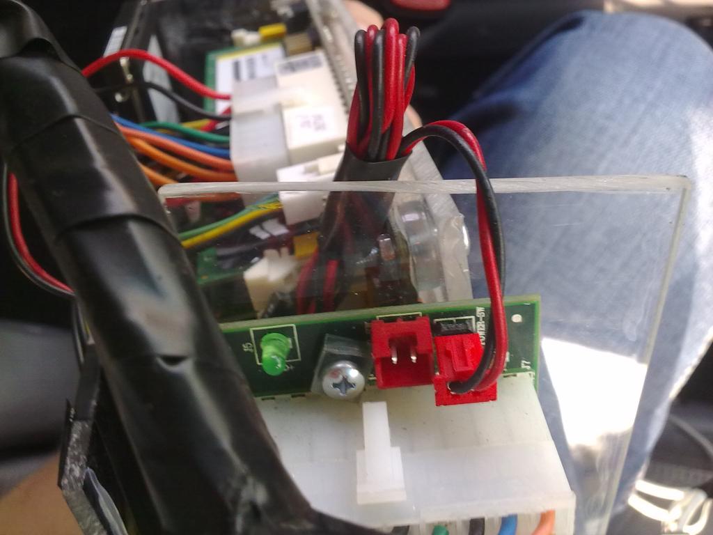 На фото провод с БП напрямую на мать (power switch). При включении зажигания через 5 сек мать заводится.