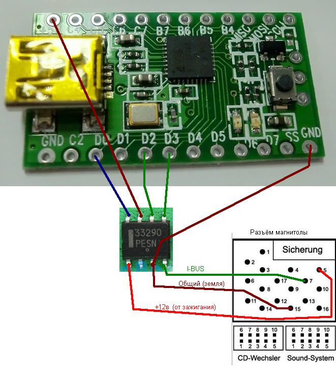 Нажатия кнопок на руле передаются по шине I-BUS. Родная голова работает с шиной на прямую. Не родные устройства, такие как планшет, компьютер (car pc), не родные головы ничего о I-BUS не знают. Так вот, данный контроллер с помощью микросхемы L9637 или MC33290 перехватывает данные на шине I-BUS (не зависимо от наличия родной БМВешной головы), выявляет нажатия кнопок на руле и пересылает нажатие в подключенное к порту USB устройство прикидываясь клавиатурой. Т.е., компьютер или планшет видят данное устройство как обыкновенную клавиатуру с мультимедиа клавишами (пример). Нажатие кнопки на руле передается по шине I-BUS через микросхему в контроллер и контроллер эмулирует нажатие одной из таких мультимедиа клавиш (или одной из обыкновенных клавиш, в зависимости от настроек контроллера). Обычно устройства с Андроидом без всяких плясок с бубном понимают такие мультимедийные клавиши, достаточно воткнуть контроллер и всё будет работать без дополнительных настроек (под всем я подразумеваю управление громкостью и переключение треков). Винда же мультимедиа кнопки без дополнительных драйверов обычно не понимает. Для работы с виндой контроллер обычно настраивают на эмуляцию обычных "горячих" клавиш, которые понимает используемый плеер. Т.е. данный контроллер можно использовать для подключения кнопок на руле к CarPC, данный контроллер нельзя использовать для подключения кнопок на руле к не штатной голове (хотя, если не штатная голова умеет работать с обычной клавиатурой, то можно, но я таких не встречал). Без микросхемы контроллер превращается в обычную клавиатуру, непосредственно к нему можно подключить только обычные кнопки.