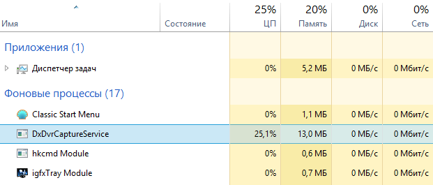 - устанавливаю сервис через учетную запись Администратор - через свою учетную запись запускаю сервис. Все работает. Через какое-то время в Диспетчере задач обнаруживаю, что служба загружает сильно процессор (было даже 56%). -пытаюсь остановить службу через Диспетчер задач, не получается. -останавливаю через cmd (получаю сообщение - служба остановлена), в Диспетчере задач - служба продолжает работать, в службах - остановлена. - удаляю весь комплект DxDvrCapture (у меня она на USB HDD). В Диспетчере задач вижу (см вложения). Систему переустанавливал несколько раз. В чем может быть причина? Откуда это берется? Как Остановить? Пытался через regedit - нет там такой службы |