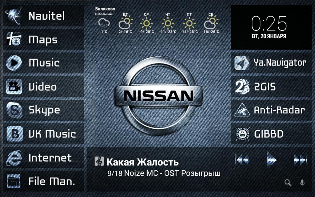 Нова+DV+Фотошоп. По лого "Ниссан" открывается список приложений, разворачиваясь из центра. Картинка в виде магнитолы подошла бы, ИМХО, в старый ретро-авто, а в моем уже стоит 2-диновая магнитола с экраном на весь корпус и ставить сверху еще одну "магнитолу" было бы странно. Тем не менее, первая обложка у AlexBor получилась прикольной, мне понравилась и пользуясь случаем хочу поинтересоваться, что это за виджет погоды, как называется? |