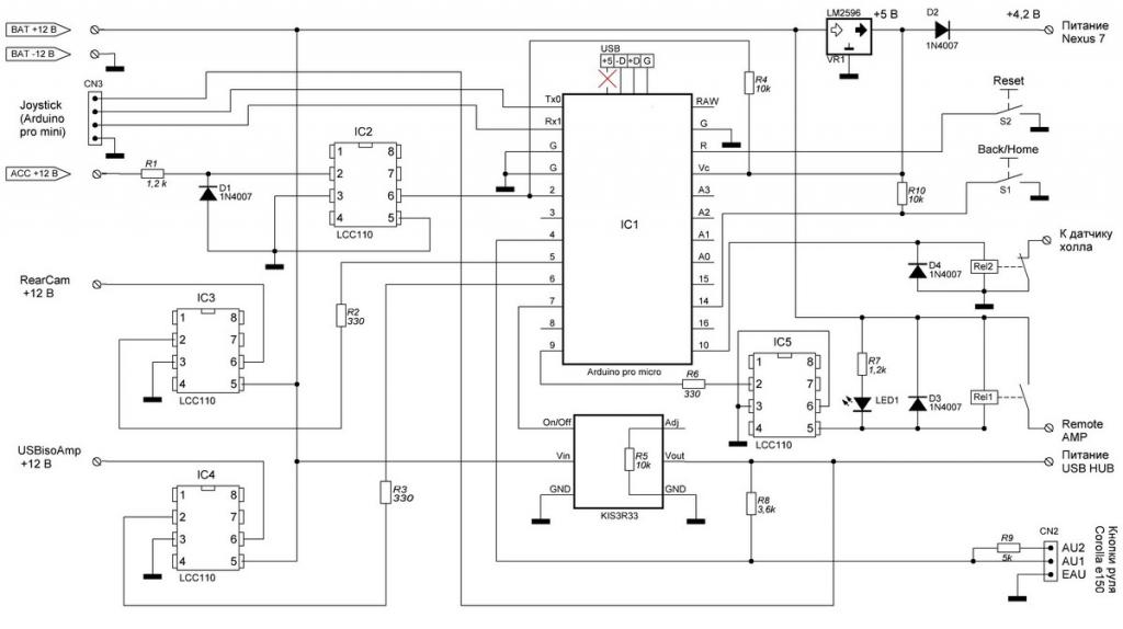 Взял за основу схему бп ув.Chubaka885, немного откорректировал под свои нужды. Немного не уверен в верности получившихся схем, поэтому прошу знающих людей проверить их, а так же помочь в редактировании скетча. Для обработки кнопок руля хотелось бы использовать скетч созданный ув. lti1