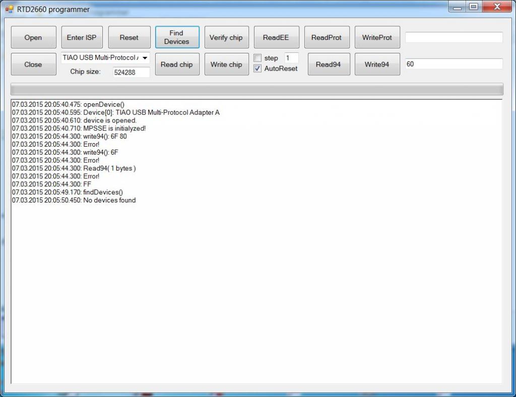 Здравствуйте! У меня вопрос: насколько легко "убить" программатор? Дело в том, что я случайно залил "левую" прошивку, контроллер замолк. Теперь программатор не находит ни одного устройства. Пробовал подключать исправный контроллер с прошивкой от ancc - тоже самое. До этого все отлично работало через VGA, спаял переходник на HDMI - тоже не идет. Боюсь, что программатор капут. TIAO USB JTAG