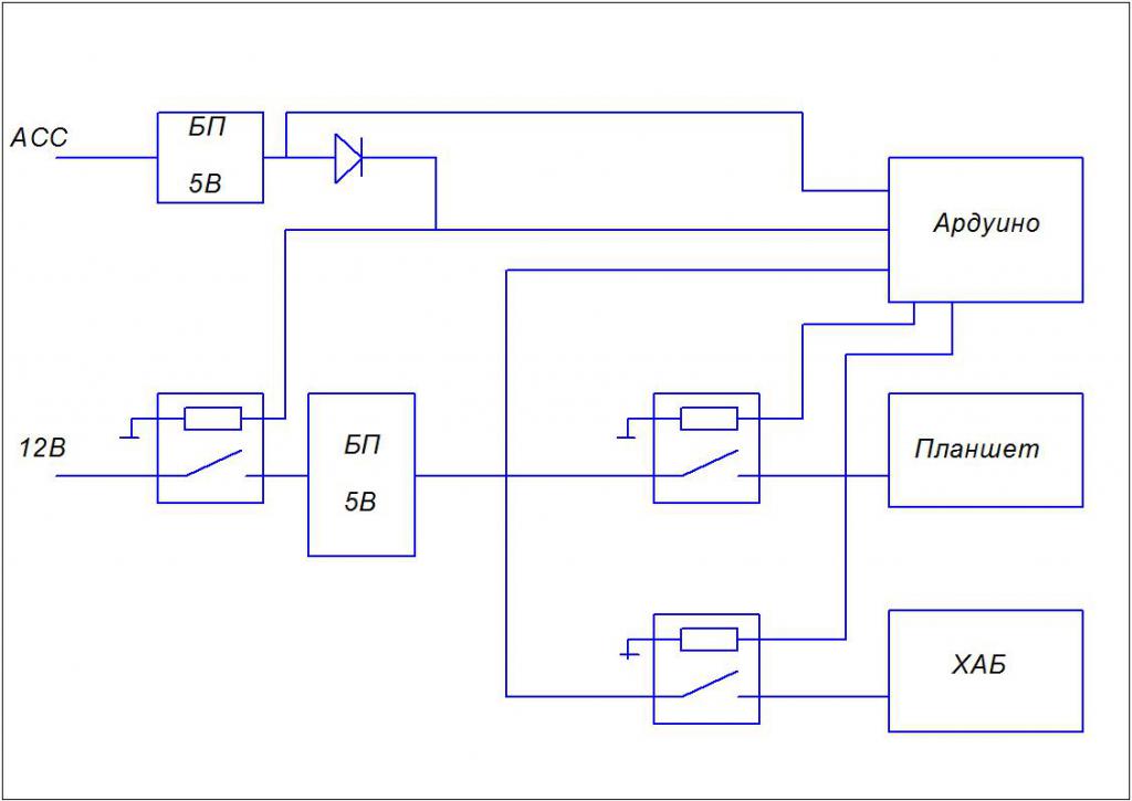 Если планшет питается от батареи, то логика такая. Включение: Подали питание на АСС, подалось общее питание (12в), на все питальники. На вход ардуино и управляющий пин пошло питание с АСС. Далее ардуино включает планшет и хаб. Выключение: Пропадает сигнал с АСС. Ардуино выключает планшет и хаб, отключается сама с общим питанием. Вот, если на релюшках.