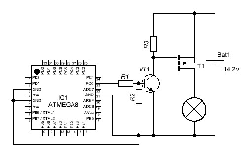 1. При таком включении ,лампочка постоянно будет светить,но не через транзистор ,а через встроенный диод... 2. Даже если перевернуть транзистор,все равно работать не будет,так как диодик от контроллера будет постоянно закрыт обратным током от +15. 3. наконец ,чтобы заработало,нужно перевернуть диодик ,но тогда ,как минимум вход контроллера пробьется от превышения напряжения на входе.. 4. зы и лампочку нужно в низ перетянуть,это чтобы ключ из транзистора получился ,а не кипятильник.. А в обще жадничать не надо ,лучше выкинуть диод и поставить транзистор,хоть поливичек,хоть биполярный...