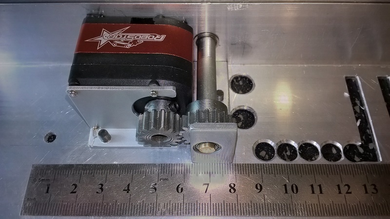 Из-за того, что оси валов пересекаются под углом в 90 градусов я в своих механизмах использую коническую передачу. Коническая шестерня, та что на серве, располагается консольно. При этом, вследствие повышенной деформации консольного вала (один из побочных эффектов конической передачи), увеличивается неравномерность распределения нагрузки по ширине зубчатого венца и как следствие - выход одного подшипника сервомотора из строя - того, что ближе и меньше по размеру на фото. Появляется значительный люфт у "подиума" в открытом состоянии. Подшипник, прямо скажу - слабоват для заявленного усилия в 53кг/см. Подобрать что-то более надежное для замены вряд ли получится. Думаю сделать небольшой промежуточный редуктор с более мощными подшипниками и перенести осевую нагрузку с подшипника сервы. Позже поделюсь результатом. |