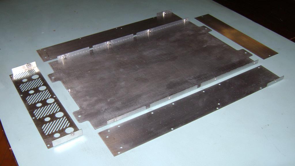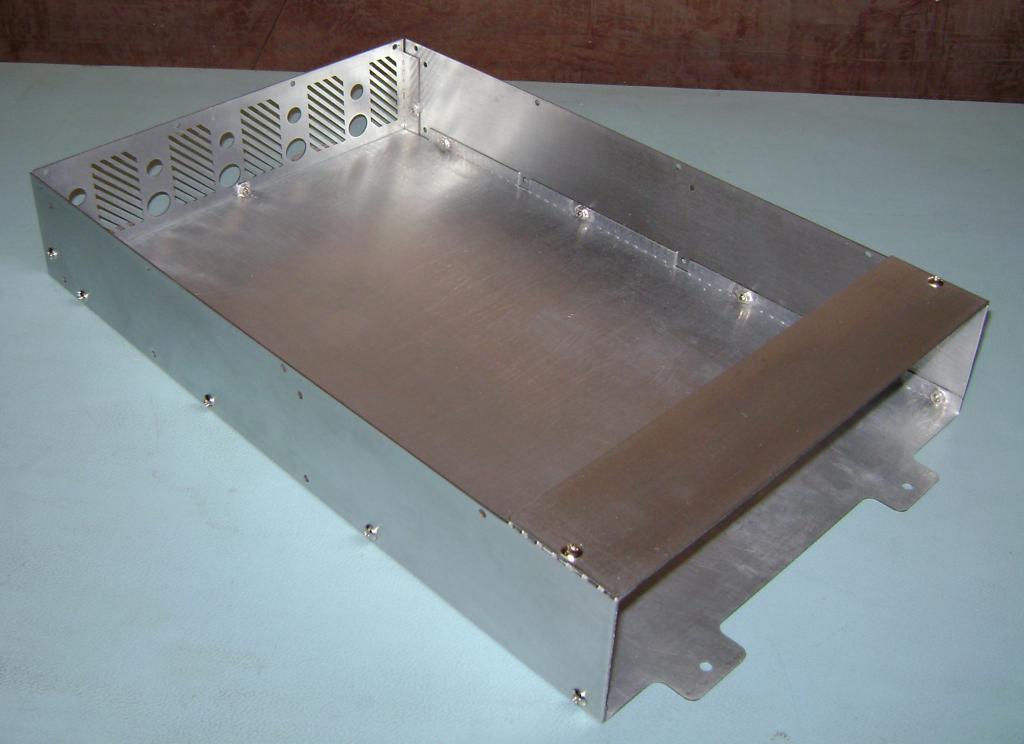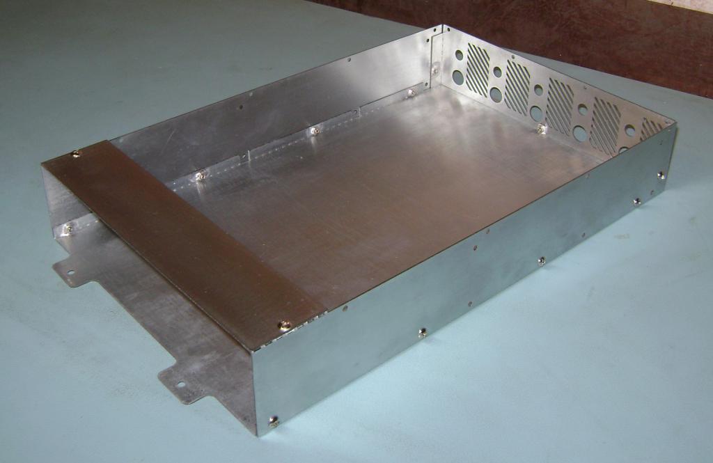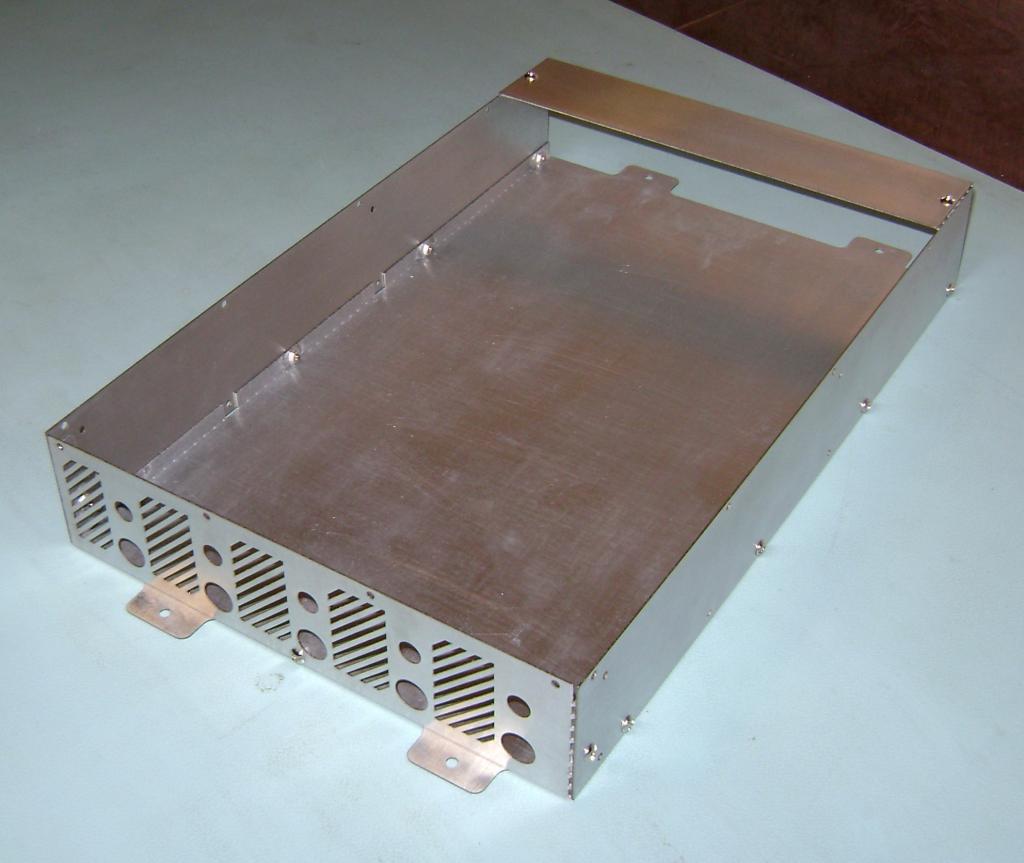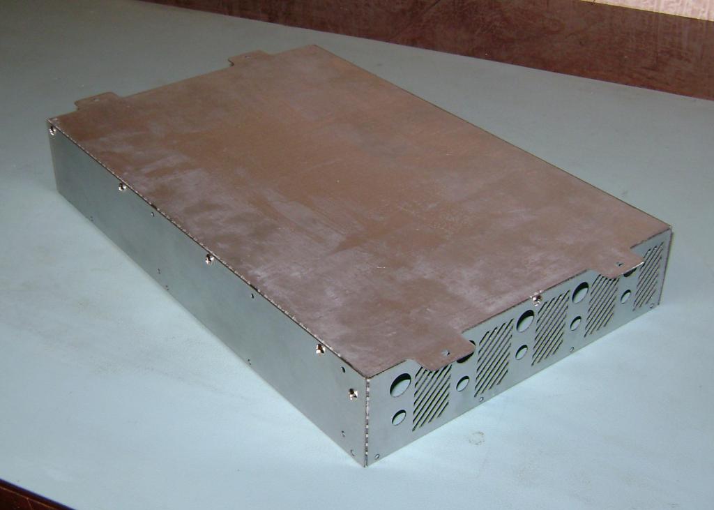 Корпусочек под покраску порошком. Размеры (без крепежных ушей, без шляпок болтов, без радиатора): 345х222х56 Оцинковка 0.8мм, лазерная резка, гайки припаяны, нижняя крышка гладкая - без болтов. |