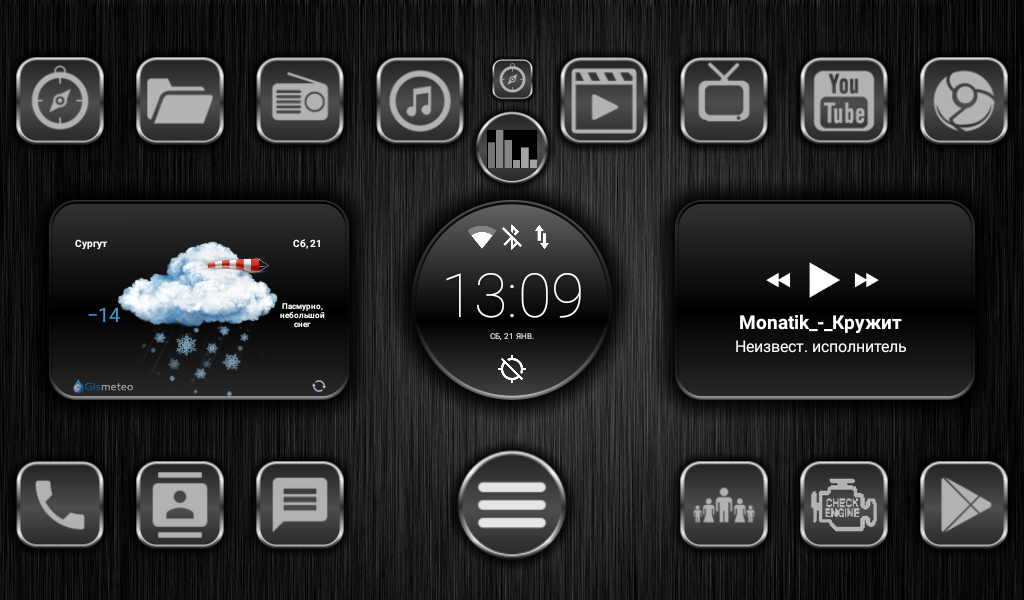 Хочу выразить благодарность Руслану "Rusel178" за помощь в создании оболочки на основе Total Launcher для магнитолы на Android. Кнопка с логотипом- это приложения. Часы в левом углу это виджет входа в настройки, температура справа это виджет который открывает "Яндекс погоду". В качестве спидометра используется "Maps Speedometer".