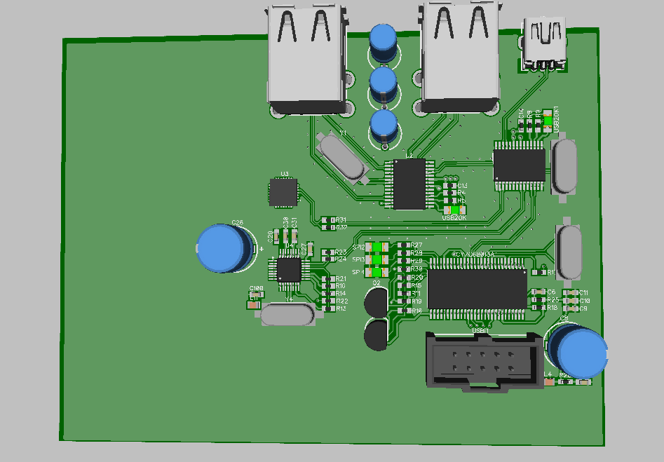 1) Развел USB HUB на GL852G 2) USB звук на PCM2706 для вывода I2S звукового сигнала 3) И программатор USBi на CY7C68013A1 для связи с DSP процессором ADAU1452 программой SigmaStudio Плата 4-х слойная. Вся земля и питание внутри. |