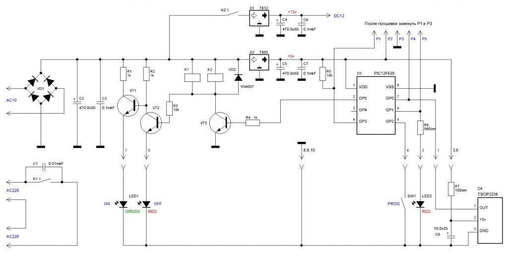 Теперь при нажатии кнопки "Power", включается реле К2 и через стабилизатор D1 подает питание на хреновину - она включается в режим блю-пуп. Реле К1 подает сетевое питание на трансформаторы питания оконечных усилителей. Далее мой приемник ДУ на пульт уже не реагирует (т.к. "9" я никогда не нажимаю) и пульт управляет хреновиной в штатном режиме.