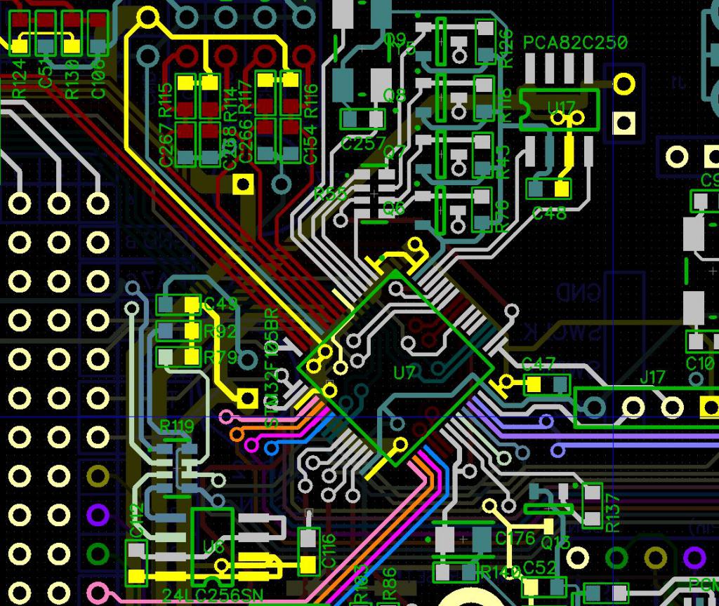 Вывел 4 UART из которых в 3-х можно передавать данные по DMA. Добавил трансивер PCA82C250 для CAN шины сразу на плату. На матрицу расширений вывел отдельные линии I2C, UART, SPI для различных модулей эти интерфейсы нигде не задействованы в плате чтоб было удобней работать. В плате задействовано 2 интерфейса UART для блютус и wifi, 1 интерфейс I2C для внешней памяти EEPROM и управления ЦАПом ADAU1962, 1 интерфейс SPI для управления DSP аудиопроцессором ADAU1452, 1 интерфейс CAN, 1 интерфейс USB, а также 2 таймера 3-й и 8-й для подключения энкодеров. Общую картину по интерфейсам добавил в картинки. |