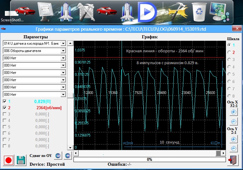 Я программой TECHSTREAM не пользуюсь, привык к TECU. Установи, (если ELM адаптер , то TECU2), там в настройках записи кадра ставишь на запись обороты и напряжение на лямбде. Заводи двиг и пиши кадр около полминуты-минуту (на прогретом до 80 двигателе). Далее останавливаешь и смотришь амплитуду в вольтах и кол-во импульсов...обороты при записи держишь постоянными 2000-2500