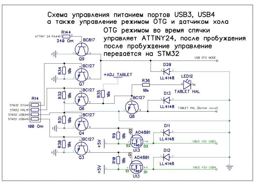 Нарисовал схему обвязки STM32, управления портами USB3-4, датчиком холла и режимом OTG.