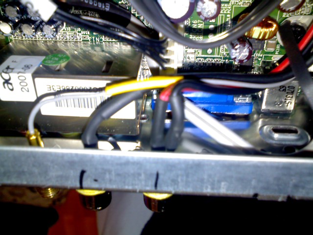 Монитор Монитор без крышки Монитор со снятым приводом Дырка после снятия вентифлятора - который нифига не охлаждает, зато через 2 недели воем заглушает работу двигателя :-) Китайская реализация кнопки Eject Свободный разъем - это я снял не нужные мне выходы-выходы звука Вот эти выходы мне нужны |