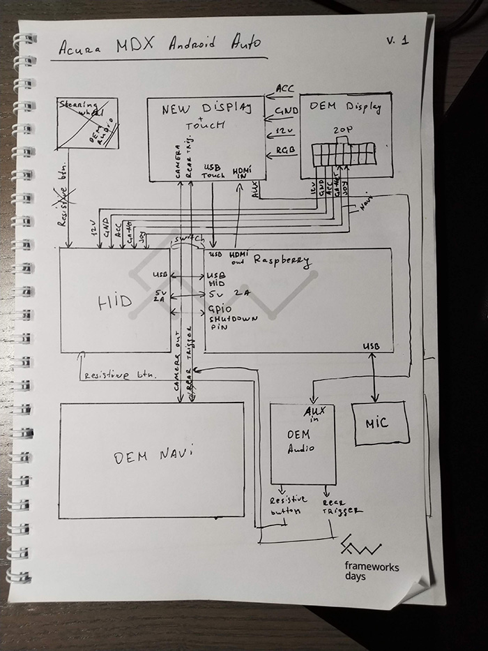 На этот раз хочется сделать немного больше, если коротко: полноценное управление с штатных кнопок через "Простой USB HID контроллер", задействовать две резистивные кнопки на руле для переключения треков, заменить штатный монитор на DJ080IA-11A с сохранением вывода штатного нави блока, установка тач скрина, микрофона. Про все это подробнее буду описывать дальше по мере продвижения. На данный момент часть комплектующих уже заказал, и разрабатываю схему будущего подключения, уже есть две версии черновика ![]() Черновик №1 Черновик №2 С черновиков не ржать, еще будете помогать правильно все это реализовать ![]() Изначально планировал подключать видео выход с штатной нави на новый монитор через этот кодер, но нашелся интересный контроллер для монитора: openrtd2662, в списке возможностей числиться подключение видео в формате RGB, и аудио выход сигнала который заходит по HDMI, это хорошо, в теории минус два лишних компонента: аудио карты для raspberry и rgb>composite кодер. Список всего железа, которое планируется задействовать: