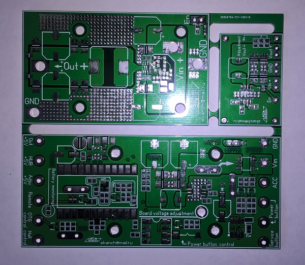 Теперь тест под полной нагрузкой до утра... P.S. И так ... Как самостоятельный блок "два-в-одном" - не "взлетел".... Когда обе платы (силовой модуль и плата управления) находятся в одном корпусе при нагрузке больше 3,5А на основном канале появляются сильные пульсации на выходе (до 150мВ) и с увеличением нагрузки только возрастают, при чём это касается только силового модуля-все остальные каналы работают отлично. Перепробовав несколько вариантов компоновки пришёл к выводу, что это связано с трассировкой общей массы на обеих платах. Поскольку силовой модуль соединяется с платой управления через ножевые клеммы (с запасом рассчитанные на максимальную нагрузку) и индуктор повёрнут в сторону полигона общей "массы" платы контроллера, предполагаю, что при таком расположении плоскости земли и питания находятся настолько далеко друг от друга, и их распределенная ёмкость настолько мала, что ёмкостная развязка практически отсутствует и это приводит к уменьшению развязывающей ёмкости между полигоном платы контроллера и верхним слоем силового модуля с расположенными деталями и ко всему прочему ещё и "излучение" от дросселя... Ставить развязывающие конденсаторы не получается из-за их габаритов. Если разъёдинить обе платы (для чего, собственно и проектировался этот вариант) и сделать управление силовым модулем по линии входного напряжения , то всё работает замечательно - при максимальной нагрузке в 9,5А напряжение стабильное практически на всём диапазоне нагрузки (0,8А - 9,5А) и пульсации не превышают 80мВ. Отлично держит "просадку напряжения при кручении стартером" до 7В при нагрузке до 7,0А. Длина проводов для входного напряжения ("+12В" и "GND") от платы управления до силового модуля была выбрана в 1 метр (для эксперимента), сечение - 0.75мм.кв. (это минимально допустимое сечение при максимальной нагрузке модуля и лучше использовать толще). Коммутация включения/выключения через силовой ключ на плате управления. Такой вариант использования подразумевает расположение силового модуля непосредственно рядом с нагрузкой (на крышке планшета или непосредственно за ним), а контроллера управления в любом удобном месте (подлокотник, консоль, "перчаточный ящик"...) и как вариант законченного решения вполне себя оправдывает. Что касается канала питания, построенного на ST1S10... Микросхема работает отлично! При максимальной нагрузке в 3,5А выходное напряжение стабильно и пульсации на выходе всего 40 мВ. Один момент не радует - сильно "темпераментная". При такой нагрузке (3,5А) греется достаточно сильно. И это на плате в 4-ре слоя! Приемлемая температура только при нагрузке до 2.5А. Буду пробовать её же в другом корпусе DFN8 (4 x 4 mm). В этом форм-факторе тепловыделение в 3 раза ниже. Ну или, как вариант попробую впаять ST1S41. Последний раз редактировалось skanch; 03.02.2019 в 20:59. |