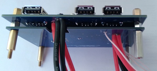 Теперь с отдельной платой питания, с дополнительной раздельной фильтрацией входной линии "12В", линии +/-5В и линии +/-3,3В питания микросхемы HUB-а. На этой же плате расположен контроллер управления алгоритмом работы HUB-а. Напряжение, подаваемое на USB разъёмы выставлено на 5,18-5,22V. Промежуточная плата коммутации силовой линии +/-5В подачи питания на USB разъёмы. Каждый порт ограничен током до 2,5А (можно настроить ограничение от 500 mA до 3А). Все силовые межплатные соединения выполнены через латунные резьбовые контакты. Питание от уже стандартного модуля +/-5,18V с током до 10А. Собрано всё в виде "этажерки". Теперь осталось сделать корпус... Характеристики: — однокристальный чип на 7 USB портов, — раздельное питание чипа от линейного стабилизатора (3,3V-1,5А) и линии разъёмов USB от мощного DC-DC преобразователя (+/-5V 10А), — режим MultiTRACK® ( МТТ-Multiple Transaction Translators), — защита от короткого замыкания каждого USB порта, — защита от превышения тока нагрузки каждого USB порта (max до 3A), — интегрированная в чип HUB-а ESD и EMI фильтрация каждой data-линии, — автоматическое выравнивание импеданса каждой data-линии, — развязка линии питания upstream-USB входа, — начало работы HUB-а только после физического подключения upstream-USB входа к хост-контроллеру, — моментальное отключение всех портов при разрыве соединения HUB-а с хост-контроллером, — коммутация каждого USB порта по времени включения, — независимая коммутация портов по data-линии, — коммутаторы data-линии со встроенным подавителем помех, — независимая коммутация портов по силовой линии +5V, — полная имитация физического подключения USB разъёма в гнездо HUB-а, — низкое собственное потребление в режиме ожидания (9 mA), — защита от выключения при кручении стартером, — управление включением питания HUB-а по линии IGN (АСС), — управление режимом OTG для андроид устройств, — отдельный USB порт для подключения и управления EasyCap для камеры "ЗХ" с полной имитацией физического подключения . Программа управления, написанная профессиональным программистом, позволяет получить практически любой необходимый алгоритм для работы HUB-а. HUB к бортовой линии питания подключён всегда и управляется внутренней схематикой по линии АСС (IGN). В отключённом состоянии потребление HUB-ом 280μА (микроампер!). Стандартный алгоритм, который я использую при изготовлении, такой: Появилось АСС (IGN), включился OTG и один USB порт (в который обязательно должно быть подключено какое-либо устройство, иначе коммутация портов в HUB-е не начнётся), если хост Андроид-устройства "откликнулся" после подключения OTG (на PC так же, но без OTG), то начинается процесс подключения каждого из пяти USB портов с интервалом в 800 миллисекунд (сначала подаётся питание +5,18V, после чего с задержкой в 200 миллисекунд происходит коммутация data-линии). Если при включённом АСС (IGN) пропадает связь с хостом, то происходит немедленное отключение всех портов (питание и передача данных). Если связь с хостом снова появилась, то повторяется алгоритм последовательного подключения, как выше. При отключении АСС (IGN) через 6 секунд HUB полностью отключается. Все временные задержки настраиваемые. Один USB порт управляется подачей внешнего напряжения (+12V) на соответствующий контакт клеммной колодки (востребован для управления EasyCap и подобных устройств), коммутируется +5V и data-линия. Есть возможность сделать задержку на отключение этого порта USB после отк