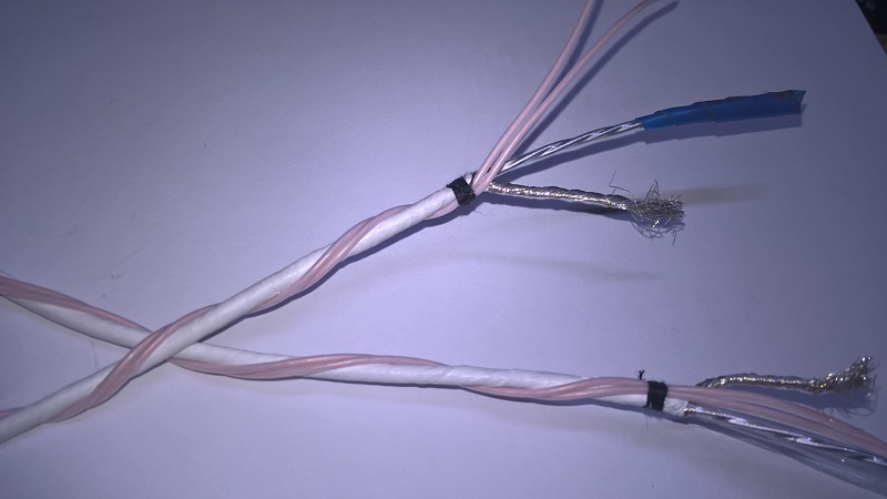 Отличия от предыдущих вариантов — экран data-пары сделал из углеродного волокна. Поскольку карбон относится к полупроводникам, то и сопротивление, и ёмкость такого экрана отличаются от стандартных параметров медно-лужёной оплётки. Сопротивление этого углеродного "рукава" — 6,7 Ом/м.пог. Длина кабеля — 4,8м/пог. Линия питания проводами МГТФ общим сечением 1.0 мм.кв. (и "плюс", и "минус") в отдельном медно-лужёном экране. Межслойный изолятор — фторопласт. При подключении пассивного преобразователя, как вариант транспорта Amanero, неизбежные потери на линии питания при максимальной нагрузке в 300 mA на такой длине составят 0,1V.. Для активных устройств таких, как HELIX DSP, линия +5V не задействована. |