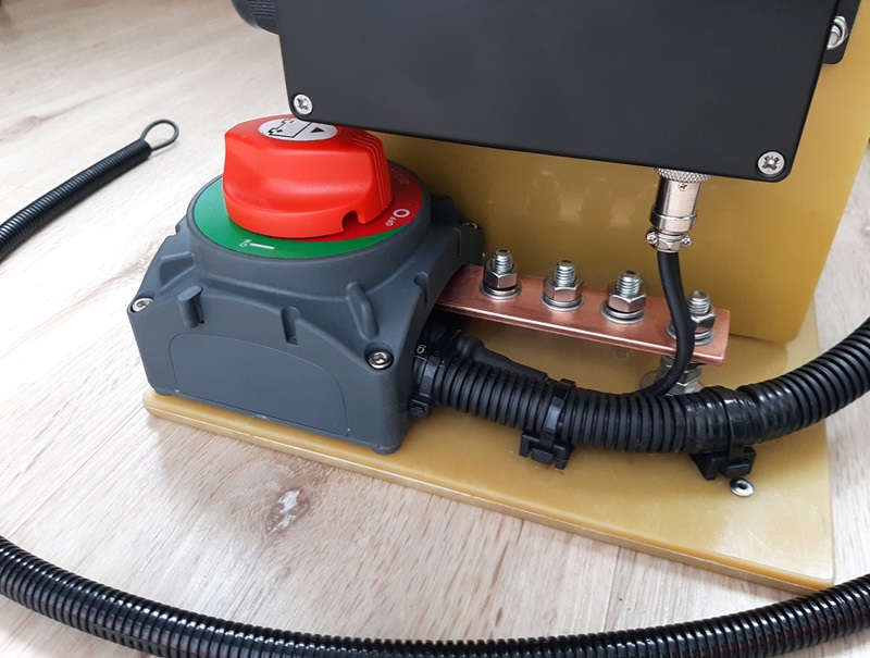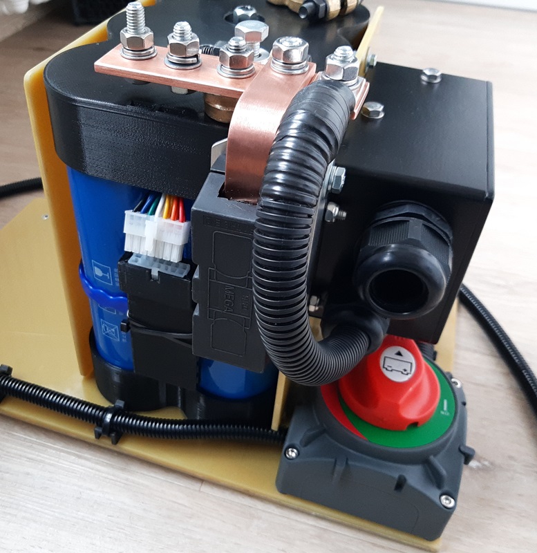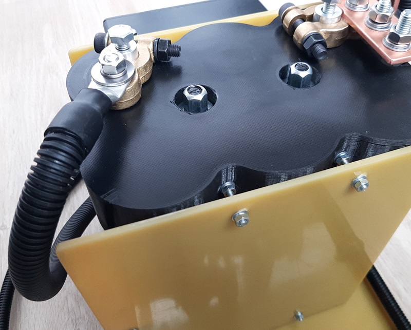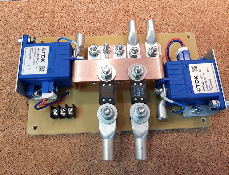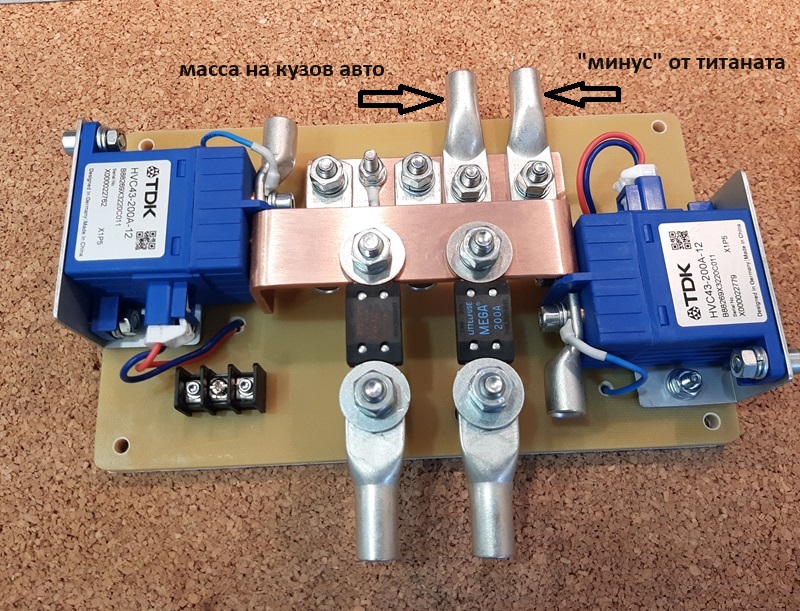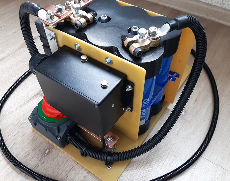 После балансировки «банок» собрал секцию. В комплекте с корпусом идут самоконтрящиеся гайки, которые я заменил на шайбу гровера + стандартная гайка. Шайба гровера по своей конструкции постоянно «подпружинивает» соединение, что по моему мнению, в условиях постоянной тряски в авто только добавляет плюсов в контактные соединения на выводах LTO. Резьбовые и контактные соединения собраны на электропроводную смазку «Суперконт СКМ». Смазка, на мой взгляд, с уникальными свойствами: «При запуске контакта в работу, по достижении температуры контакта выше 45С, частички легкоплавкого компонента расплавляются, более плотно заполняют микро и макро неровности рабочей поверхности, т.е. увеличивают рабочую площадь электропередачи, уменьшают величину переходного контактного сопротивления. Одновременно начинают растворяться частицы металла с более высокой температурой плавления, например, меди, создается новый сплав, который постепенно кристаллизуется, создавая твердую электропроводящую прокладку, по сути моделируя холодную плакировку контактной поверхности алюминиевых контакт-деталей. Твердая электропроводящая прокладка создает надежную антикоррозийную защиту от попадания в рабочую зону влаги, агрессивных химических агентов из окружающей атмосферы.» Источник. Крепёж в конструкции использую с классом прочности 10.9 и 12.9, нержавеющий А2-70 и А4-70. Верхнюю и нижнюю крышки корпуса для LTO дополнительно фиксирую пластинами из стеклотекстолита, толщиной 4мм. «Банки» стянул «поясом» из перфоленты, «одетую» в толстостенную термоусадку, для предотвращения их подвижек внутри корпуса при тряске во время движения авто. Все края «банок», которые теоретически могут соприкоснуться друг с другом проложил резиновой изоляцией. Комплектные шпильки с гайками заменил на класс прочности 10.9. Верхняя гайка жёстко зафиксирована эпоксидным клеем на шпильке. Через трубчатую направляющую с внешним диаметром d10мм и стенками по 1мм, которая не даёт перетянуть пластиковые крышки корпуса, секция надёжно крепится к основанию из стеклотекстолита новыми шпильками. Трубки «упаковал» в термоусадку. Конструкция получилась достаточно прочной и с надёжным креплением АКБ. Реле развязки использую специальное газонаполненное, с камерой гашения электродуги при размыкании контактов, что предотвращает «слипание» контактов под нагрузкой. Подобные реле используются в электромобилях в системах высоковольтного питания и коммутации при больших токах. В алюминиевом корпусе размещается реле, контроллер управления этим реле и предохранитель силовой линии «плюс», предназначенный для защиты провода до потребителя. Силовые провода ПВ6-З сечением 50 мм2. Наконечники медно-лужёные. Опрессовка сделана гидравлическим прессом. Контроллер управляется по линии IGN и имеет функцию отслеживания напряжения на АКБ. Реле замкнёт контакты, если на управляющем проводе будет напряжение не ниже 12.28В и разорвёт контакт, если напряжение снизится до 11.95В (защита LTO от разряда при работе на заглушенном двигателе). Есть также задержка на отключение в 5 сек., что предотвращает отключение реле во время кручения стартером. Силовые провода помещены в гофрорукав из негорючего полипропилена. Выводы силовых проводов из корпуса сделаны через сальники-муфты, провод управления и «массы» через разъём. П