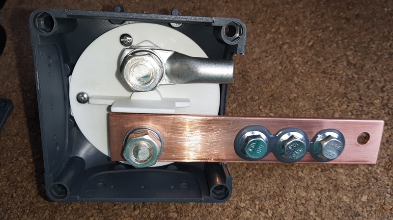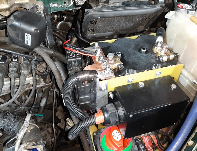На клемму «плюс» поставил медную шину-дистрибьютор сечением 30мм х 4мм. Дополнительно пропаял соединение оловянно-медным припоем. На шине использую стальные оцинкованные болты и гайки М8, классом 10,9. С обратной стороны шляпки болтов приклеены к шине эпоксидным клеем. Болты и гайки для затяжки клемм с резьбой М8, класс прочности 12,9. Линия «минус» сделана через силовой коммутатор «массы» с номинальным током нагрузки 600А. Выбор именно этого выключателя обусловлен качественной конструкцией, хорошей контактной группой – мощные площадки контактов, с качественным покрытием и плавным без «задиров» переключением. Габариты внушительные, но это того стоит! Вход на коммутатор сделан проводом сечением 50мм2 через обжатый наконечник и с монтажом ответной части провода на кузове авто. Выход – через медную шину 30мм х 4мм с дистрибьютором на несколько подключений. Крепёж М8. Так выглядит секция в сборе на площадке для установки на штатное место АКБ под капотом. Подключение "дубляжа" линии "плюс" от генератора до титаната сделано через предохранитель. Перед финишной установкой сборки LTO под капотом, разъём "Molex" балансира герметизируется изоляционной резиной "Cotran". Что бы "разгрузить" тяжёлую клемму, сделал дополнительное крепление к корпусу. Проход моторного щита силовыми проводами линий «плюс» и «минус» планируется через сальники-муфты. Последний раз редактировалось skanch; 23.04.2024 в 12:15. |