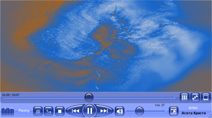 Сразу предупреждаю, скриншоты от преальфы, интерфейс кое в чем изменен. Окно квадратное, поскольку будет встроено как компонент в фронт-енд. Но ничто не мешает использовать его как отдельное приложение (даже с полосой оконного заголовка и крестиком на ней). Таскается за любую точку, кроме кнопок и компонентов. На этом скриншоте показан внешний вид переделанного плей-листа. Фон сделан зеброй для удобства. Высота изображения трека подобрана таким образом, чтобы можно было нажимать пальцем. Двойного щелчка не требуется, один клик - трек сменился. Для выделения треков можно щелкнуть справа от песен и произвести выделение "резиновой рамкой". Поскольку в дороге одним пальцем выделять треки неудобно, расстояние оставлено небольшое, для стилуса/мыши/ногтя. Выделенные треки четко отличаются от текущего трека на проигрывании, поскольку рисуются как обычные выделенные элементы, а трек на проигрывании - сами видите как. Тулбар (панель инструментов) сверху уже сейчас переделан, это будет удобное меню для работы с текущим плей-листом. При изменении размеров таблица перестраивается, чтобы отображать максимум информации. Едем дальше. Окно визуалайзера/видео. Вообще есть три режима: плей-лист, Library и визуалайзер/видео, переключение идет при нажатии одной из трех кнопок справа от полосы позиции в треке. На самой полосе отображается в виде тайминга текущая позиция в треке и общая длина трека. Я прикручивал еще и оставшееся время со знаком минуса, но от этого больше неудобств было, чем пользы: шесть пар цифр - с первого взгляда и не отличишь. Еще я делал тени под надписями для контраста, но они тоже только ухудшали восприятие. Обратите внимание: на этом скриншоте время отображается слева, на предыдущем - справа. Оно выводится так, чтобы указатель на полосе никогда его не загораживал, при этом я не стал резервировать под него отдельное место, которого и так немного. Сам указатель тоже сделан таким, чтобы его можно было двигать пальцем. Но это необязательно: можно и просто щелкнуть по любой точке на полосе, указатель сместится "одним прыжком". Обратите внимание: слева от кнопок эквалайзер и строка статуса. Строка статуса показывает, как легко догадаться, текущий статус плеера: "Стоп", "Пауза", "Соединение с сервером" и т.п. Эквалайзер - самый настоящий, а не просто картинка, при проигрывании показывает частоты текущего трека. Его роль не чисто декоративная: при нажатии на него появляется эквалайзер, позволяющий настраивать частоты. Не знаю, как назвать эти два типа эквалайзеров, один для отображения, второй - для настройки. Справа - краткая информация о треке, которая выводится по очереди, через небольшую паузу: Исполнитель, Альбом, Длина трека, Битрейт. Если текст не помещается, он прокручивается ("бегущей строкой"). Едем дальше. Такой вид приобретет окно, если его размер зажать до минимума. Непомещающиеся элементы исчезают сами собой, кроме полосы позиции в треке. Самая правая кнопка на этом скришоте переключает три режима: с двумя панелями (не первом и втором скриншоте), с одной панелью (как на этом скриншоте) и полноэкранный режим, из которого можно выйти одним нажатием в любой точке. Полоса громкости позволяет задавать громкость с точностью до 1%. Сами кнопки тоже адаптированы под нажатие подушечкой пальца. Слева направо: Shuffle (не знаю, как по-русски, локализац