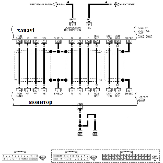 Уважаемые форумчане, у меня в 100% японское авто (бесполезное тв, нави, СД без МП3 и тд.,) поставил второй монитор для задних пассажиров ПКМ700, с ВГА входом, сенсорный, но хотелось и на штатном спереди тоже иметь картинку с ПК, в связи с чем вопрос. Я нашел распиновку контактов монитора и контролера дисплея (Xsanavi -навигация); прикладываю схемы общения монитора и контролера дисплея (Xsanavi) - "распиновку". Я хочу попробовать вариант подключения - схема ниже, правилиный ход подскажите и где ошибки. Фото разъемов ниже